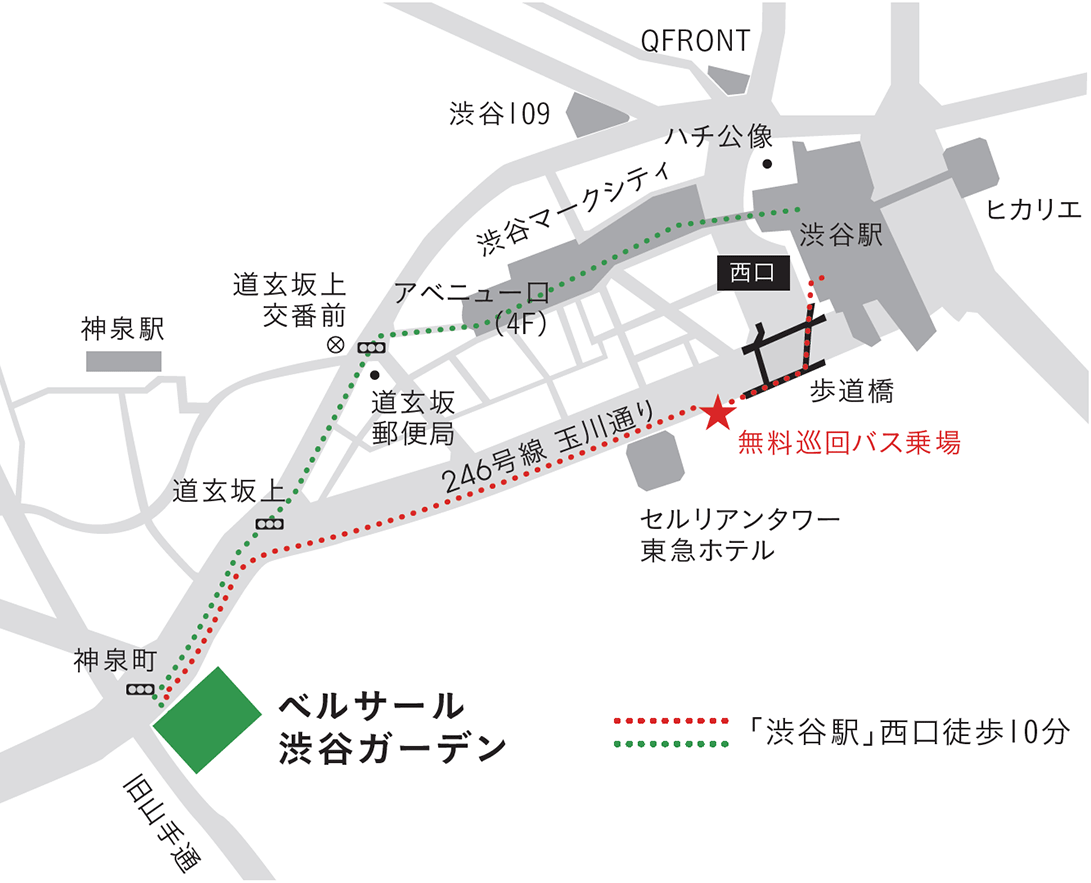 ★バス乗場は、渋谷駅西口出口の歩道橋をセルリアンタワー側に降りた所にございます。